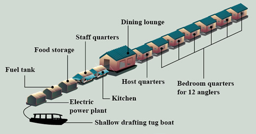 The arrival day float plane flight, plus the daily shallow drafting Cabin cruising, effectively replaces daily 3-5 hours fast bass boat traveling, or expensive daily Fly-Outs, from the main waterways to the secluded lagoons protected by shallow water entry barriers.