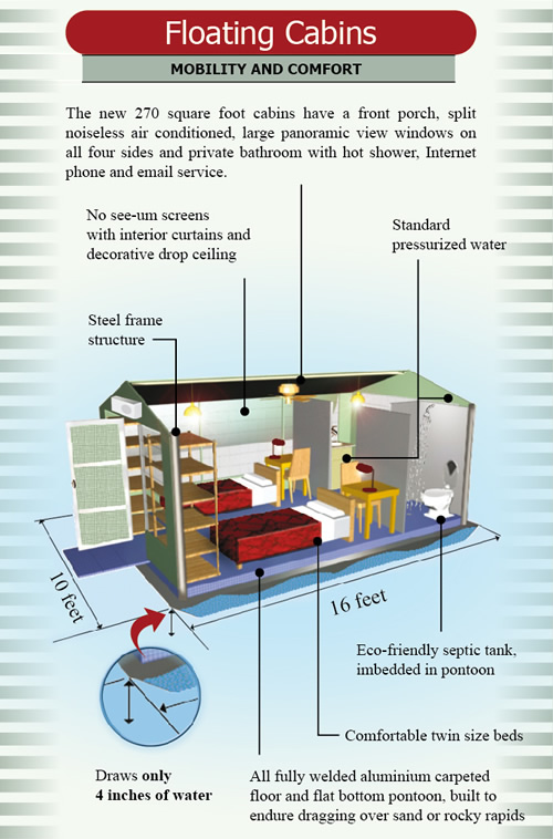 You will be able to walk in at any time from the nearby secluded prehistoric-looking lagoons into the luxurious comfort of your 12’ X 15’ elegant and roomy cabin. Cabins have private full bathrooms; and are fully carpeted, tastefully decorated, and every detail has been carefully considered.